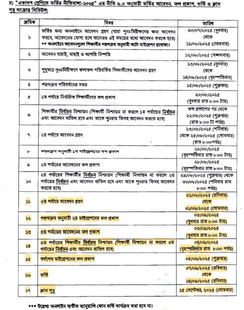 একাদশ শ্রেণিতে ভর্তির নীতি মালা ২০২৫, এর নীতি ৬.০ অনুযায়ী ভর্তির আবেদন, ফল প্রকাশ, ভর্তি ও ক্লাস সংক্রান্ত জরুরি নোটিশ।